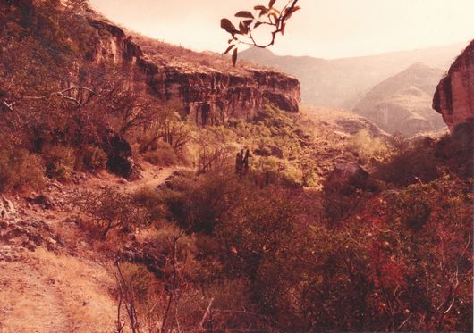 lluvia; con pendientes de 45 grados, y probablemente más, para bajar a, y subir de, los lechos de los torrentes, adentrándose cada vez más en un cañón, grandioso y cada vez más estrecho.